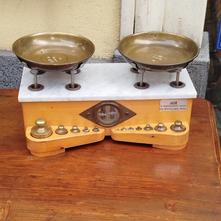 Bilancia a due piatti vintage - cassa legno e marmo - piatti e pesi in ottone - pesi da 500 a 2 g. Misure 55,5 x 18 x 20 cm. Info 3495611398