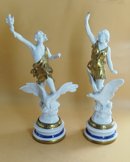Coppia statue porcellana Capodimonte finitura oro zecchino e blue cobalto. Una delle due necessita di restauro come da foto.. Misure 29x13cm . Info 3495611398