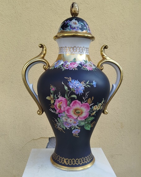 Vaso poutiche fine porcellana Vieux Paris vintage. Pomolo del coperchio da restaurare come da foto.. Misure con manici 46 x 32 x 22 cm