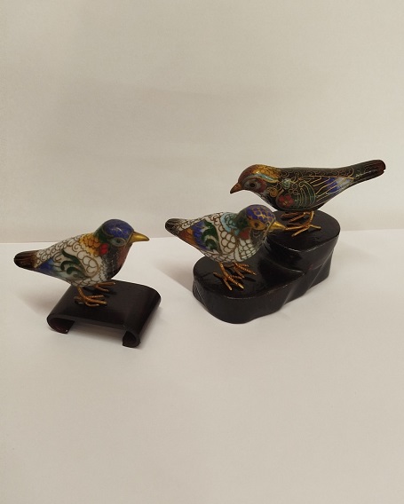 Tris uccelli bronzo Cloisonne' vintage con basi in legno . Misure uccellini circa 7x3,5x2cm