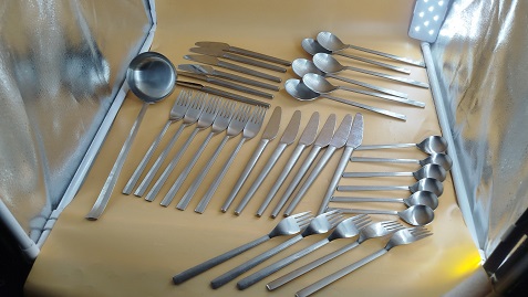 Servizio posate vintage in acciaio F.lli Calderoni composto da 6 forchette,6 coltelli,6 coltelli,6 cucchiaini,6 coltelli,5 forchettine e 1 mestolo.