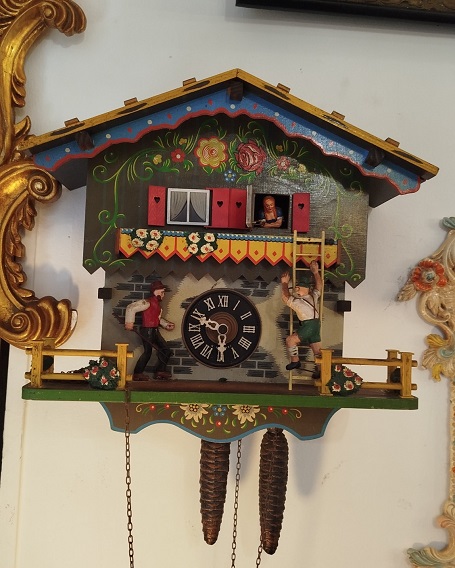 Orologio tedesco chalet a cucù vintage in legno decorato a mano. Misure 30 x 30 x 17 cm . Pigne da 13 cm. Mancante di pendolo. Allora scoccare dell'ora partira' cucù e il contadino muoverà il braccio con il forchettone,poi partirà il cucù aprendo l'altra finestrella e l'alpino farà sù e giù sulla scala. Meccanismo da revisionare.
