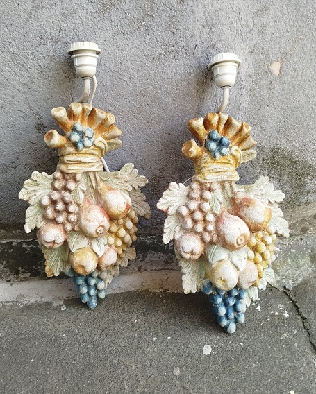 Coppia di applique vintage artigianato fiorentino in legno intagliato e laccato.Misure compreso il portalampada 52 x 28 x 9 cm. Possibilità di acquisto complete di paralume. Info 3495611398