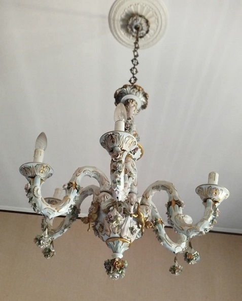 Lampadario vintage sei bracci porcellana di 💐Capodimonte💐 Ottima manifattura. Altezza solo tronco senza catena 76 cm - diametro 60 cm . Info 3495611398