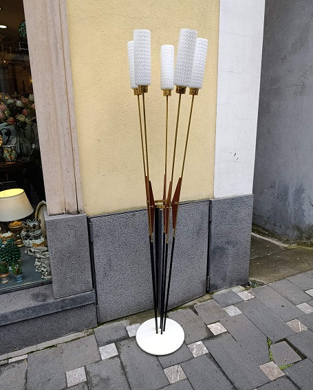 Bellissima piantana anni 50' Stilnovo 5 luci in metallo verniciato,ottone ,teak e vetro . Un vetro presenta delle filature come da foto. Misure 174 altezza - diametro superiore 39cm - diametro base 31 cm . Info 3495611398