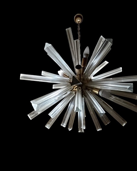Bellissimo lampadario Sputnik a prisma vintage 9 luci con triedri in vetro di Murano. Misure altezza 60cm - diametro 80cm - con triedri da 28 cm ( 11 in omaggio) e da 20 cm ( 3 in omaggio). Ottime condizioni - Spedizione in tutta Europa - Info 3495611398