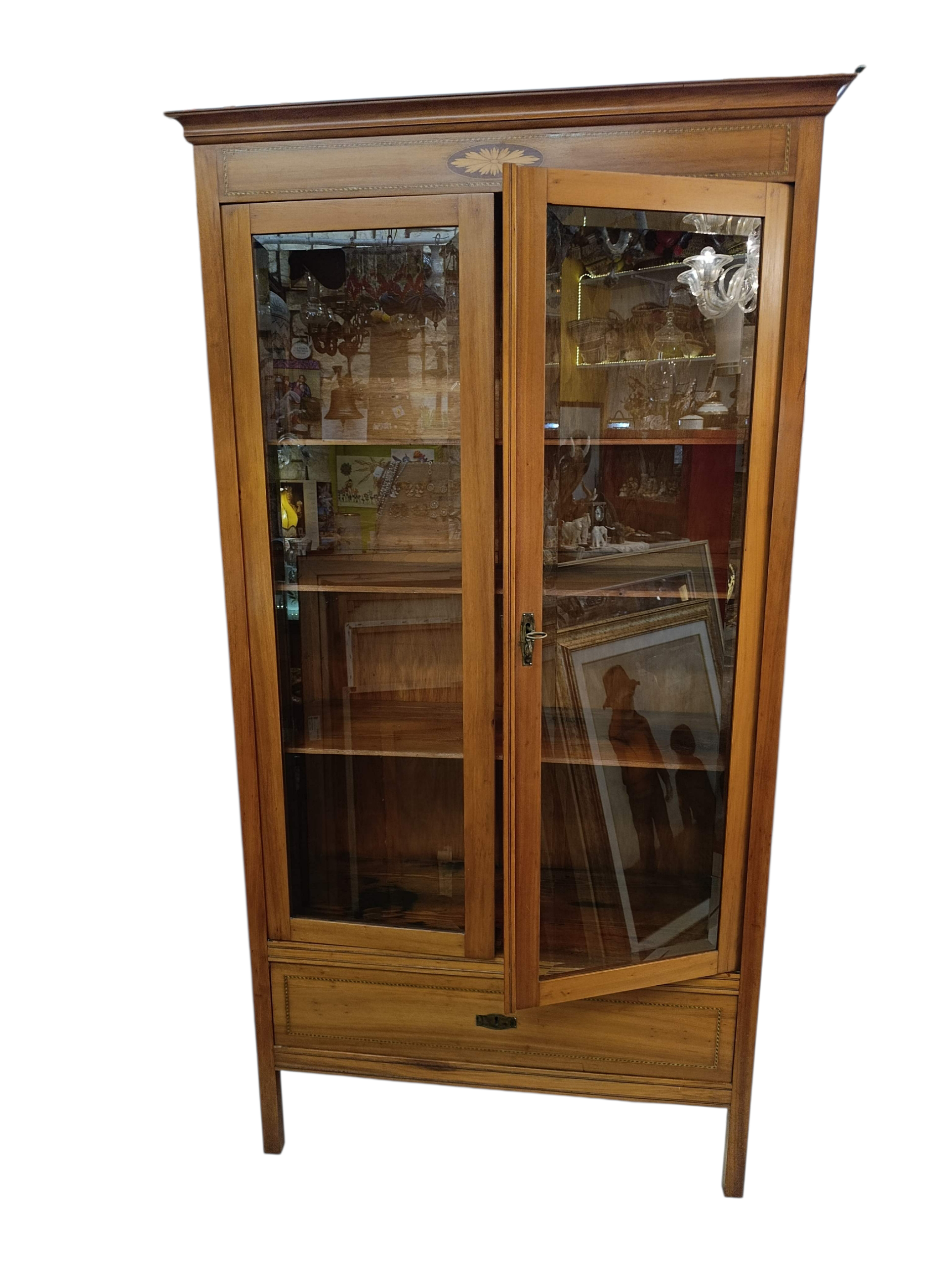 Deliziosa Libreria/Vetrina Liberty con intarsi .Due ante con vetri molati e 4 ripiani interni. Cassetto in basso. Restaurata. Misure 207x108x42cm . Info 3495611398