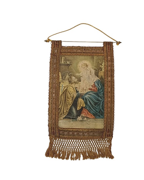 Delizioso stendardo Liberty soggetto Sacra Famiglia - misure con rosa asta ottone ( senza il cordoncino) 43 x 30 cm .. ottimo stato. Info 3495611398