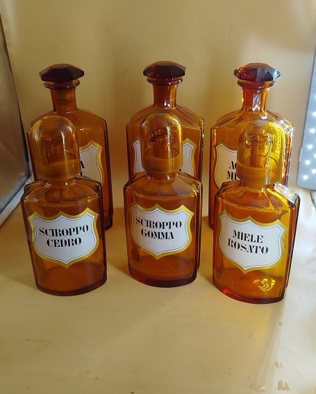 Gruppo sei bottiglie vetro antiche da farmacia. Perfetto stato. Altezze ,tre da 35 cm e tre da 33 cm. Info 3495611398