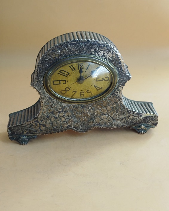 Orologio da tavolo inizi 900' cassa legno e argento cesellato.Misure 19,5 x 13 x 4,5 cm