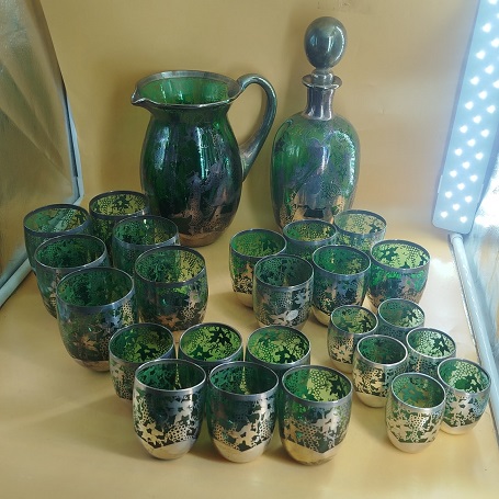 Bellissimo set vetro anni 40' da Rosolio , liquore , acqua finitura argento 925 composto da una Caraffa 19,5 cm - una bottiglia con tappo 28 cm - sei bicchieri 9 cm , sei bicchieri 8 cm ,sei bicchieri 7 cm e sei bicchieri 6 cm. Totale 225 pezzi . Ottimo stato. Info 3495611398