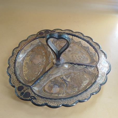 Antipastiera vetro anni 40' finitura argento 925 . Misure 28 x 12 cm . Ottimo stato. Info 3495611398