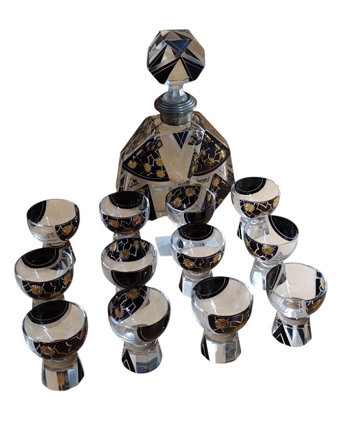 Bellissimo set in cristallo da rosolio Art decò composto da bottiglia con collo in argento 23 cm e 12 bicchierini 6,5 cm . Perfetto stato. Info 3495611398