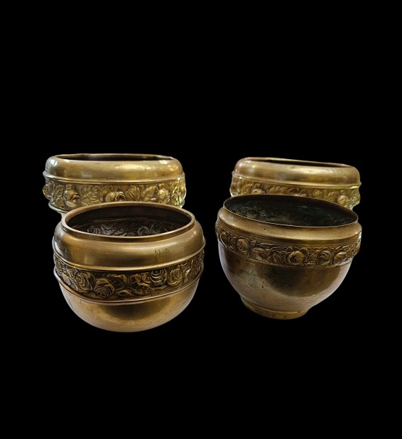 Gruppo 4 cachepot ottone epoca Liberty. Misure due da 23x15cm ( bocca interna 18cm ) uno da 15x12cm ( interno 11,5cm ) e uno 17x13cm ( interno 14,7cm). Info 3495611398