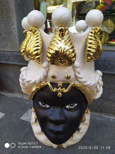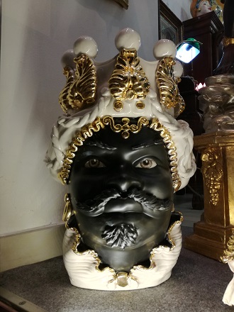 Moro in ceramica di Caltagirone firmata Verus. Mod. viso nero opaco con corona bianco lucido. Dettagli in oro zecchino brillante (x11-00100).Altezza 48,5 cm. Venduta con certificato di garanzia. Prezzo come da listino Verus