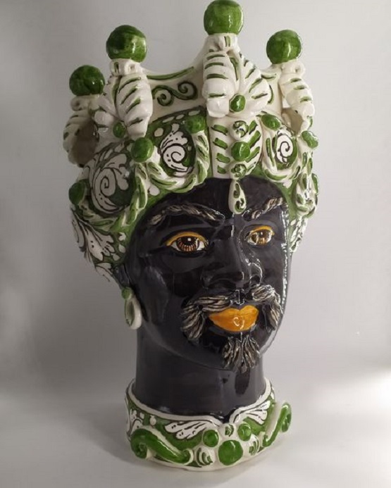 Coppia teste di moro ceramica di Caltagirone mod. vaso verde h. 12 cm