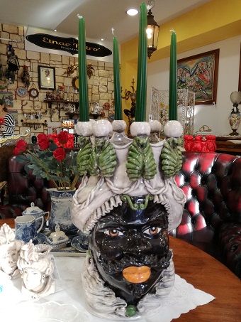 Testa di moro porta cendela in ceramica di Caltagirone firmata Verus. Decoro foglie effetto lucido. Altezza 48,5 cm.