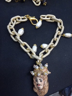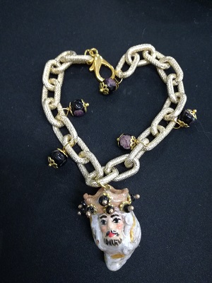 Bracciale donna manifattura artigianale con moro in ceramica double-face (Viso umo da un lato e femminile dall'altro) dipinto a mano e arricchito con perline.