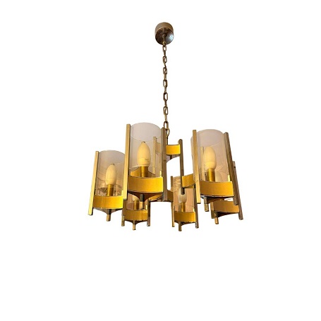 Lampadario Stilnovo anni 60' ottone, alluminio e vetro. Altezza 78cm - diametro 60 cm